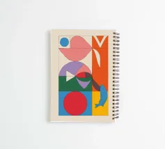 A composition featuring bold geometric shapes and vivid colors forms an abstract mosaic. Elements like circles, triangles, and a blue whale create an intriguing visual balance within the rectangular layout.