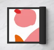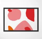 Una composizione astratta minimalista e giocosa di forme semplici e ritagliate in una tavolozza di rosa, rosso e crema. L'opera d'arte è leggera, allegra e ha un'atmosfera moderna e spontanea.