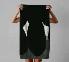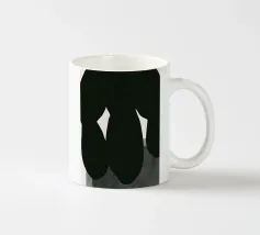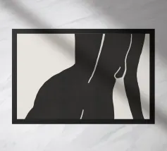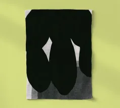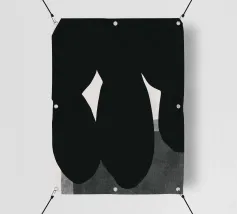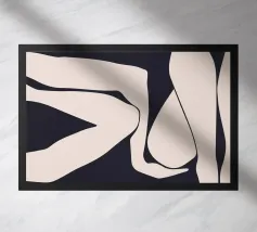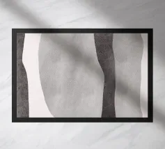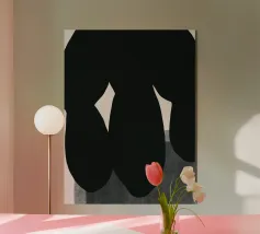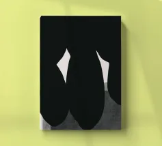 Forme astratte nere e audaci si sovrappongono su uno sfondo chiaro, creando una composizione dinamica e intrigante. Il contrasto tra le forme scure e lo sfondo tenue attira l'attenzione sul gioco delle forme e dello spazio negativo.