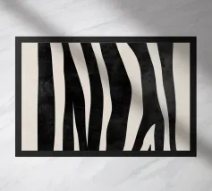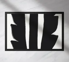 Un'audace silhouette nera di una pianta con due foglie si staglia su uno sfondo grigio strutturato. I colori contrastanti conferiscono un aspetto minimalista e moderno.
