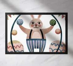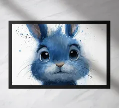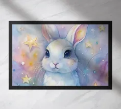 Un dipinto ad acquerello raffigura un simpatico coniglietto dalle lunghe orecchie, reso in morbide tonalità pastello di blu, rosa e giallo. Il coniglietto ha grandi occhi espressivi e un'espressione dolce. Gocce di pioggia colorate in varie tonalità di blu, verde, giallo e rosa cadono dall'alto, aggiungendo un tocco stravagante alla scena. Lo sfondo è una miscela di lavaggi leggeri ad acquerello, che creano un effetto morbido e sognante.