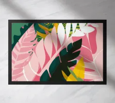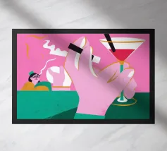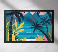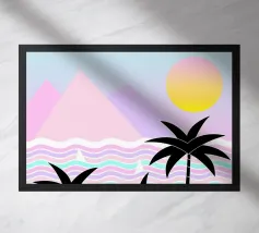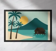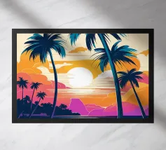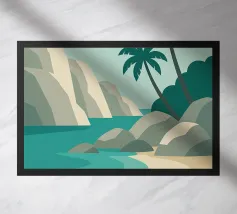 Un poster di viaggio in stile vintage raffigura una serena scena di spiaggia con palme e montagne, con il testo "Picasso", che evoca una fuga nostalgica e artistica verso la costa.