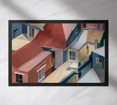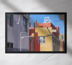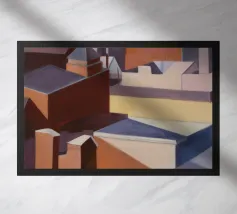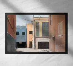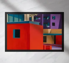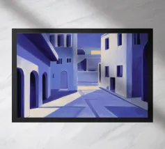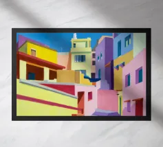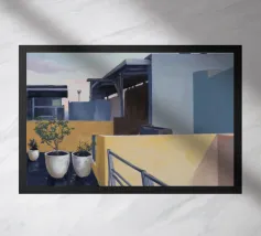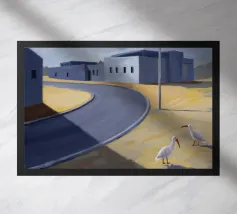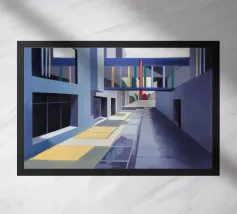 Un sentiero giallo brillante si snoda elegantemente attraverso un paesaggio minimalista di edifici grigi e squadrati. Il dipinto è uno studio sul contrasto dei colori e sulle forme geometriche pulite, che creano una scena urbana serena ma di grande impatto visivo.