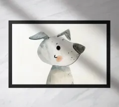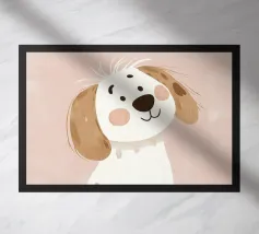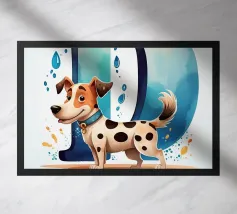 Un simpatico cucciolo di dalmata gioca felice in un prato fiorito, circondato da una farfalla e da fiori in un'incantevole illustrazione ad acquerello.