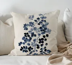 Quest'opera d'arte presenta una delicata disposizione di forme floreali astratte, dipinte con acquerello indaco. I fiori appaiono sparsi lungo una sottile e sinuosa liana che attraversa verticalmente la composizione. I petali variano nella tonalità di colore, da un tenue slavato a un blu intenso, creando un senso di movimento e di ritmo organico sullo sfondo neutro.