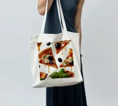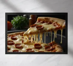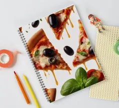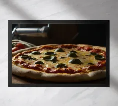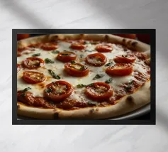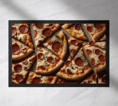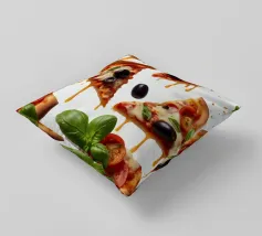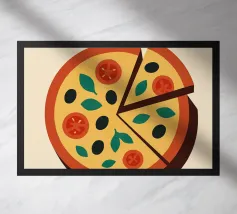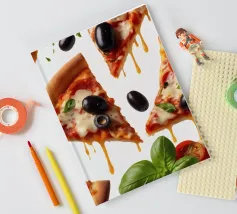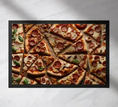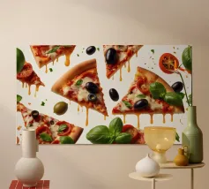Diversi tranci di pizza sono esposti ad arte con condimenti vivaci come olive, pomodori e foglie di basilico fresco, creando un'invitante visione culinaria.