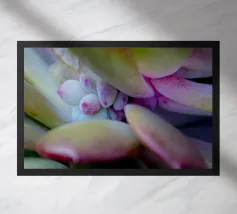 Una ripresa macro rivela i dettagli intricati delle strutture riproduttive di un fiore. Il fiore presenta un nucleo centrale verde circondato da un anello di strutture gialle e arancioni simili a stami. Delicati peli bianchi bordano la base del fiore, aggiungendo consistenza. Lo sfondo è nero, per enfatizzare i colori vibranti e la forma complessa del fiore.