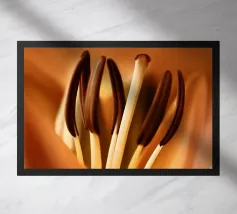 Una ripresa macro rivela i dettagli intricati delle strutture riproduttive di un fiore. Il fiore presenta un nucleo centrale verde circondato da un anello di strutture gialle e arancioni simili a stami. Delicati peli bianchi bordano la base del fiore, aggiungendo consistenza. Lo sfondo è nero, per enfatizzare i colori vibranti e la forma complessa del fiore.