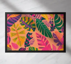Un motivo vibrante e diffuso di foglie tropicali stilizzate nei toni del giallo, del rosa, del verde acqua e del verde, che crea un'esposizione botanica rigogliosa ed energica.