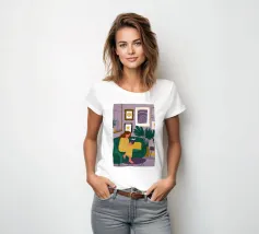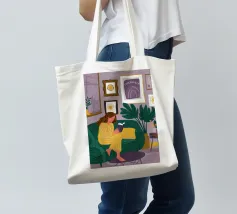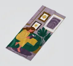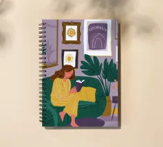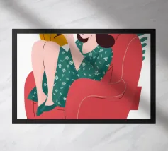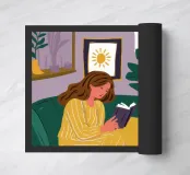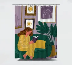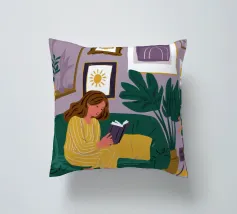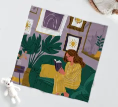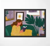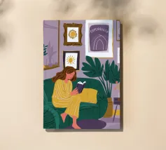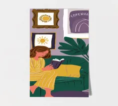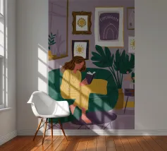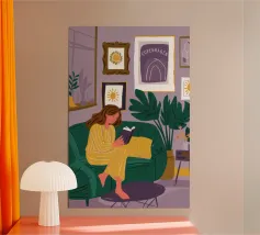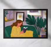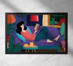 Una donna si accoccola su un divano verde, immersa in un libro e con una tazza di tè vicino. La stanza è decorata con piante e opere d'arte, creando una scena perfetta di confortevole solitudine e fuga intellettuale.