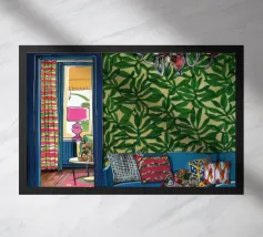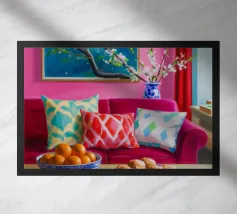 Un lussuoso divano di velluto rosa si trova tra due tavolini con lampade, in una stanza con pareti rosso intenso e tende blu a fantasia. La scena è equilibrata, serena ed emana un'eleganza sofisticata e lunatica.