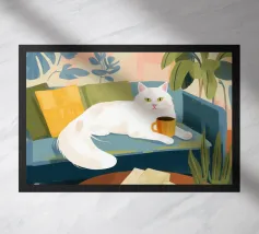 Un'illustrazione affascinante e accogliente di un gatto "smoking" bianco e nero che dorme pacificamente su un divano giallo, circondato da piante in vaso. L'opera d'arte cattura la gioia semplice e tranquilla di un pisolino.