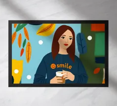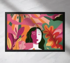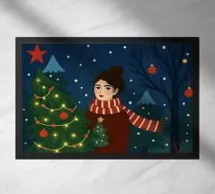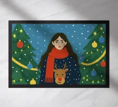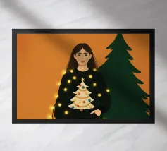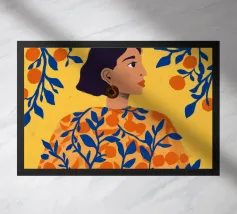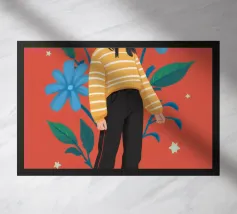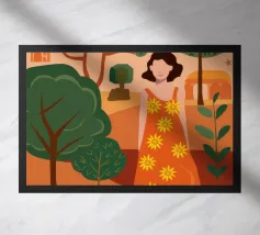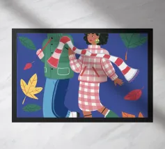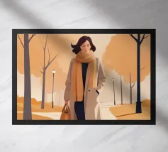 Una scena autunnale con una giovane donna che cammina lungo un sentiero che attraversa una colorata foresta autunnale. Lo sfondo è di un vivace azzurro cielo, che crea un contrasto deciso con le tonalità calde delle foglie e del fogliame autunnale. La donna indossa uno spesso maglione marrone, una sciarpa giallo senape avvolta attorno al collo e pantaloni a righe verticali arancioni, gialle e bianche che riprendono le tonalità autunnali circostanti.