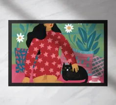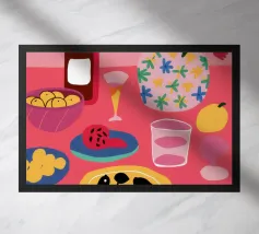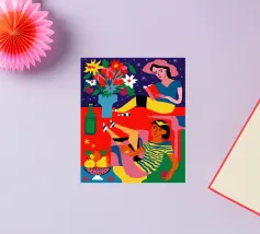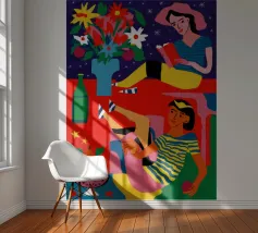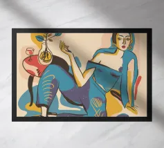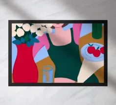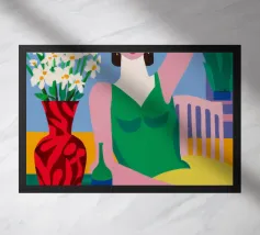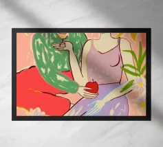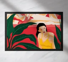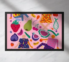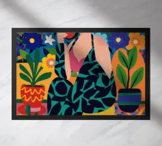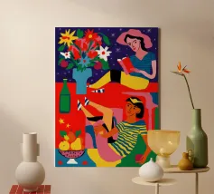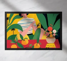 Un ritratto stilizzato di una donna con fluenti capelli scuri circondata da un'abbondanza di fiori e frutti colorati, che celebra la vita, la fertilità e la creatività.