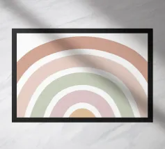 Una rilassante illustrazione grafica astratta a doppio arcobaleno, caratterizzata da linee e forme geometriche bianche in tonalità verde salvia e soffice pesca. Questo disegno sereno e minimale evoca l'inizio della primavera, la tranquillità e l'ottimismo, perfetto per aggiungere un fascino di ispirazione rétro al vostro spazio. Ideale per ravvivare una stanza tranquilla, dona armonia ad opere d'arte da parete, cuscini e accessori, offrendo un'estetica pacifica per una vita moderna.