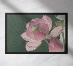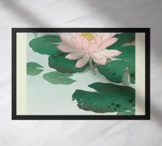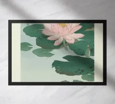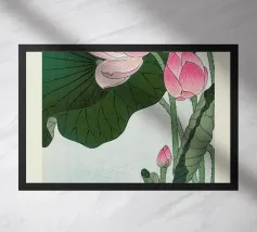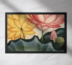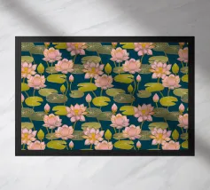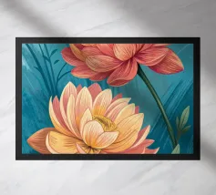 L'immagine mostra due eleganti fiori di ninfea con petali esterni bianchi e interni arancioni, accompagnati da foglie verdi e rotonde di ninfea su una superficie d'acqua scura. Lo sfondo scuro mette in risalto i colori vivaci dei fiori e delle foglie. Stilisticamente, l'illustrazione è dettagliata e ricca di texture, con un'attenzione particolare ai contrasti di colore e alle forme morbide e naturali. Un gioco estetico di calma e intensità cromatica.
