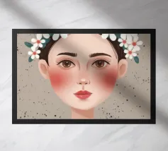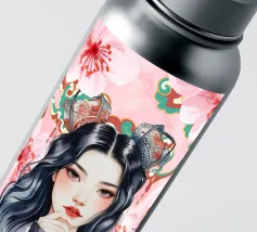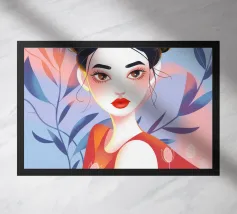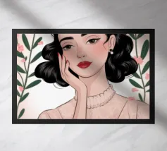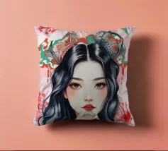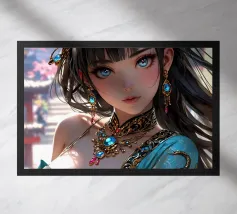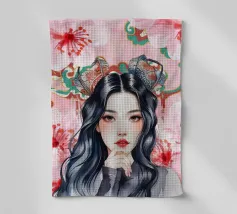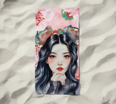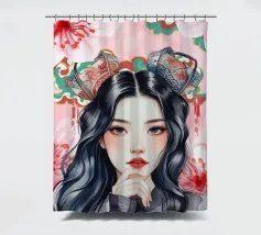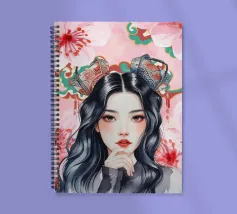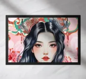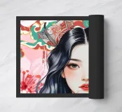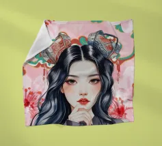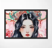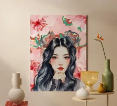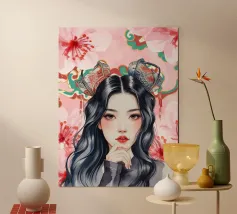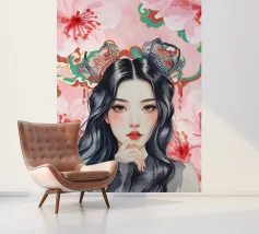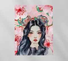 Una splendida illustrazione digitale di una giovane donna aggraziata su uno sfondo di fiori di ciliegio rosa e intricati motivi orientali. La sua espressione serena, i fluenti capelli scuri e gli ornamenti per capelli di ispirazione tradizionale evocano una bellezza senza tempo e una tranquilla sicurezza.