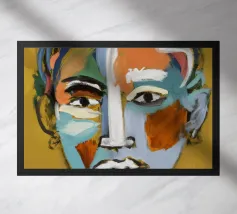 Questo dipinto presenta un volto stilizzato con colori vivaci e forme geometriche. Il volto ha occhi grandi ed espressivi, un naso prominente e una camicia a righe. Lo sfondo è un mix di tonalità arancioni e gialle.