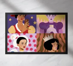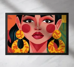 Questo dipinto raffigura una persona con i capelli neri che indossa un abito colorato con forme geometriche. Lo sfondo è rosso e la persona è adornata con grandi orecchini circolari.