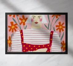 Questo dipinto raffigura una persona con i capelli scuri acconciati in due chignon, che indossa grandi orecchini arancioni. Il volto della persona è dipinto con audaci motivi rossi e bianchi, mentre lo sfondo è di colore rosso pieno.