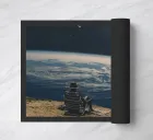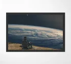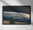 A surreal digital collage showing a lone person sitting on a chair at the edge of the world, staring into deep space. Earth curves beneath them, a shooting star cuts across the sky. A quiet moment of detachment — about stepping away from noise, chaos, and expectations, just to breathe and watch the universe.
