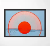 Questo quadro geometrico astratto e minimalista mostra una forma circolare centrale di colore rosso arancio brillante, circondata da due anelli concentrici semitrasparenti di una tonalità più chiara di arancio. La composizione è divisa orizzontalmente da un gruppo di sottili linee nere che coprono la parte inferiore del cerchio interno e ricordano l'orizzonte o uno specchio d'acqua. Le linee sottili si irradiano anche dalla parte superiore del cerchio interno. Lo sfondo è di un colore azzurro calmo e uniforme. L'opera emana una calma chiara, quasi spirituale.