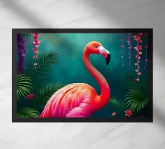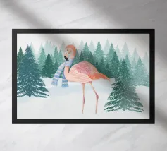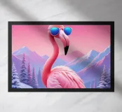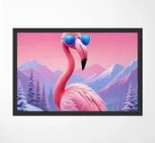 Date alle vostre pareti qualcosa per cui sorridere. Questa opera d'arte audace e stravagante presenta un fenicottero sicuro di sé che si erge fiero in una scena invernale innevata, con tanto di occhiali da sole riflettenti e piume rosa acceso. La vivace palette di colori mescola i caldi toni tropicali con i freddi blu artici, creando un giocoso contrasto visivo che cattura immediatamente l'attenzione.