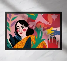 Questo vivace ritratto pop art presenta una rossa sicura di sé che indossa audaci occhiali verdi da gatta e un dolcevita giallo. Il mix di elementi retrò e moderni crea una divertente dichiarazione di intelligenza, stile e impavida individualità.