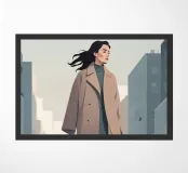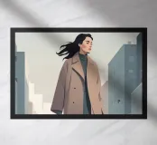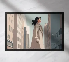 Una donna elegante cammina in un ambiente urbano sobrio, con il cappotto che scorre e la borsetta in mano. I toni calmi e la luce delicata sottolineano l'indipendenza e lo stile sicuro di sé.