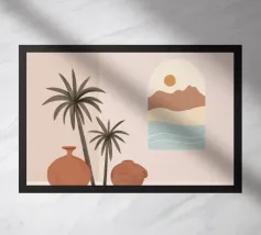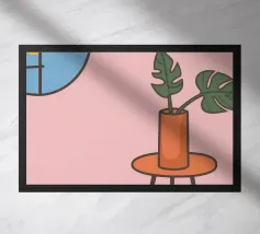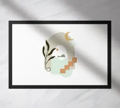 Una composizione minimalista con una scala rosa, una pianta in vaso e una mezzaluna su una parete rosa tenue. Quest'opera d'arte emana un senso di serena semplicità da sogno e un'estetica moderna.