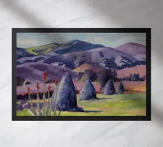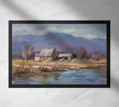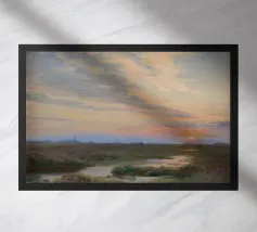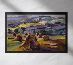 Un dipinto di paesaggio con un grande pagliaio in un campo vicino a un fiume o a uno specchio d'acqua tranquillo. Il cielo è di un grigio tenue e coperto, e la tavolozza generale è sobria con toni terrosi.