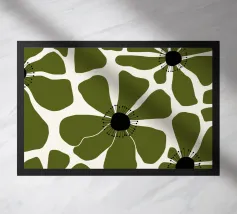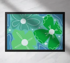 Un motivo di fiori stilizzati presenta grandi petali verdi e piccoli petali azzurri, ciascuno con un centro giallo. Il disegno è astratto e ripetitivo e trasmette un'estetica audace e moderna.