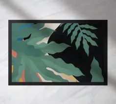 Un'illustrazione semplice ed elegante di una singola grande foglia di palma su uno sfondo morbido e strutturato a due tonalità. Lo stile è minimalista e rilassante.