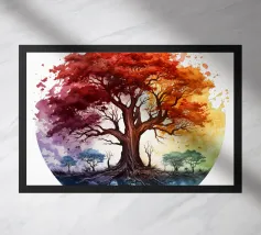 In superficie, un gruppo di alberi stilizzati esplode di colori, con le loro chiome che formano sfere di blu, arancione e giallo vibranti, alcune delle quali sono giocosamente divise in due metà contrastanti. Questo gioioso spettacolo di colori è rispecchiato da un'intricata rete di radici rosso intenso sotto la superficie, che simboleggia la forza nascosta e la connessione fondamentale che sostiene la vita. Le sfere colorate sparse aggiungono un'atmosfera stravagante ed energica, evocando un senso di meraviglia e di crescita. Perfetto per aggiungere un tocco di creatività e armonia naturale a qualsiasi spazio, questo pezzo celebra sia l'individualità che l'unità.