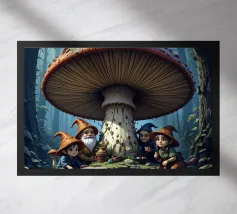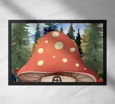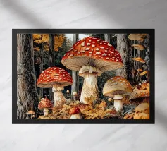Tranquilla scena di foresta con alberi alti con foglie autunnali vivaci, grandi funghi rossi con macchie bianche circondati da erba e rocce e un'atmosfera nebbiosa con alberi di conifere lontani.