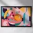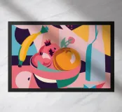 Una natura morta astratta giocosa e colorata con forme decostruite che rappresentano frutta, foglie e vasi. La composizione energica e la tavolozza vivace creano un'interpretazione gioiosa e moderna di un tema classico.