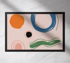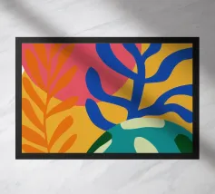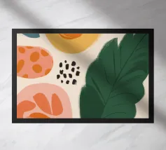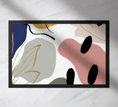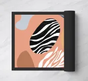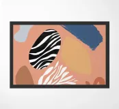 Un'opera d'arte astratta contemporanea che combina diverse texture e forme. Un'audace pennellata blu contrasta con un ovale zebrato e con morbide forme organiche di foglie, creando una composizione dinamica e tattile.