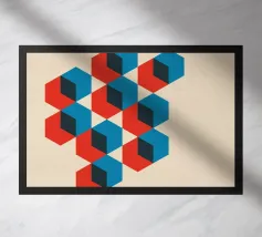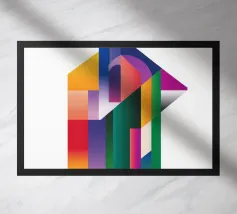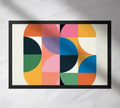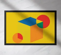 Una vivace disposizione di forme geometriche in vari colori crea un disegno intrigante su uno sfondo di luce soffusa, sottolineando l'arte e la creatività moderne.