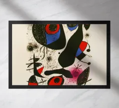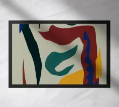 Forme e linee astratte creano una composizione giocosa su uno sfondo tenue, caratterizzato da una varietà di colori ed elementi curvilinei. Il design evoca un senso di movimento ed equilibrio, attirando lo sguardo sulle sue forme organiche.