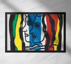 Questo dipinto mostra una composizione astratta con un mix di forme geometriche e organiche. I colori sono decisi e comprendono il nero, il blu, il rosso e il bianco. Le forme si sovrappongono e creano un senso di profondità.