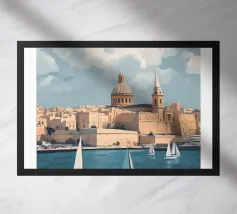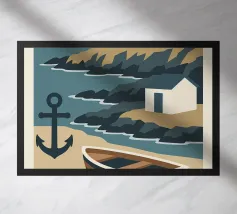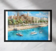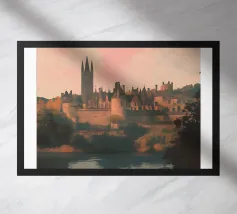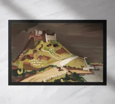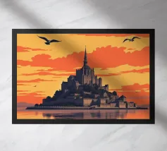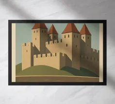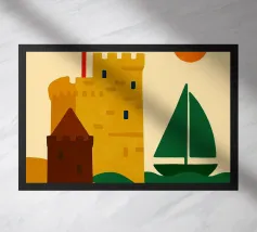 Una formidabile e semplice fortezza con alte mura e torri si erge sul bordo del mare, la cui forma spoglia è evidenziata dalla luce di un sole basso.
