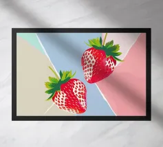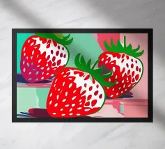Una singola fragola è al centro di questa opera colorata e moderna. Lo sfondo turchese e rosa con struttura astratta contrasta con la superficie lucida del frutto. L'opera d'arte ricorda la pop art e colpisce per la sua presenza grafica e i suoi colori decisi. Ideale per cucine moderne, spazi di design o come elemento di richiamo in un ambiente creativo.