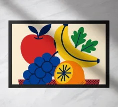 "Fruit Bomb" è all'altezza del suo nome: è un'esplosione grafica. Un accumulo esplosivo di frutta - anguria, banane, ciliegie, ananas, limone, uva, arance, prugne - in uno stile cartoonesco, incisivo, quasi fumettistico. L'effetto è immediato: gioia, energia e un irresistibile desiderio di mordere l'immagine. Ideale per dare una dose di allegria e colore alla cucina, allo studio creativo o alla sala da pranzo.