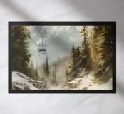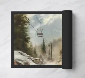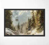 Questo idilliaco motivo invernale mostra una funivia che attraversa una foresta montana innevata fino alle maestose vette. I caldi raggi del sole illuminano la scena, mentre gli abeti e le montagne innevate creano un'atmosfera alpina da sogno. Un'opera d'arte che cattura perfettamente il fascino della natura, dell'avventura e delle vacanze invernali, ideale per tutti gli amanti della montagna e degli sport invernali.
