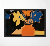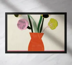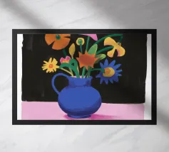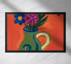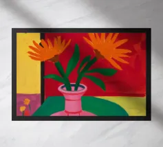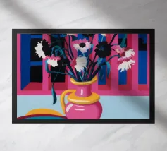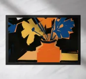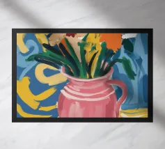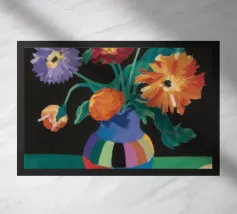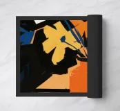 Un'opera d'arte astratta vibrante ed espressiva con una fusione di colori audaci di ispirazione fauvista come il magenta, l'arancione e il nero. Le pennellate e le forme energiche creano un'opera dinamica e appassionata.