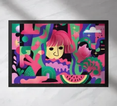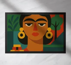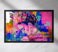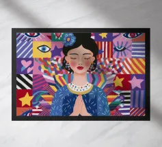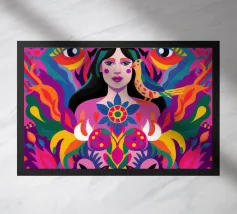 Il dipinto presenta una persona circondata da motivi intricati e colorati, creando una composizione dinamica e vivace.