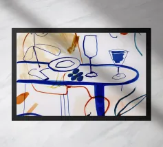 Illustrazione grafica ravvicinata delle gambe di una persona in collant a righe bianche e nere, con un bicchiere di vino rosso vicino. La composizione è moderna, chic e ha un'atmosfera audace, sofisticata e leggermente misteriosa.