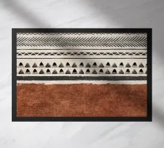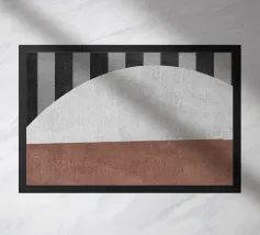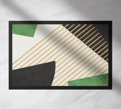 I motivi geometrici dominano l'immagine, con linee nere verticali su sfondo bianco. Varie forme, tra cui triangoli e rettangoli, si alternano per creare un senso di equilibrio e simmetria.