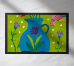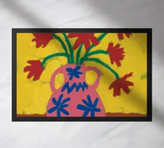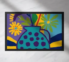 Un allegro ed espressivo bouquet di fiori gialli in un vaso blu brillante con due grandi manici. Lo sfondo giallo solare esalta la sensazione di gioia pura, semplice e senza fronzoli.