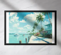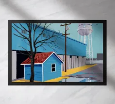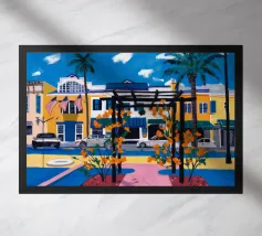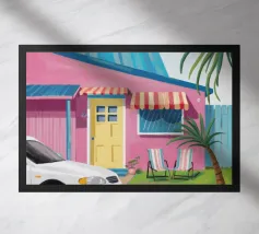 Un dipinto di un edificio modernista con un caratteristico tetto angolato, probabilmente in un luogo come Palm Springs, caratterizzato da linee pulite, palme e una fresca luce blu.